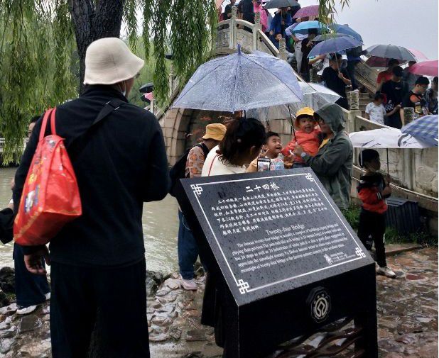 我们一行人从南门进入,穿过白塔,来到了二十四桥,才说天气不错,突然就下起了小雨,还好我们有准备,提前带了雨伞,我收回之前不相信天气预报的话,哈哈。